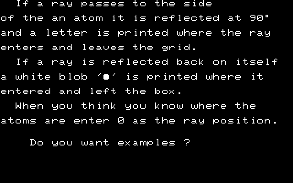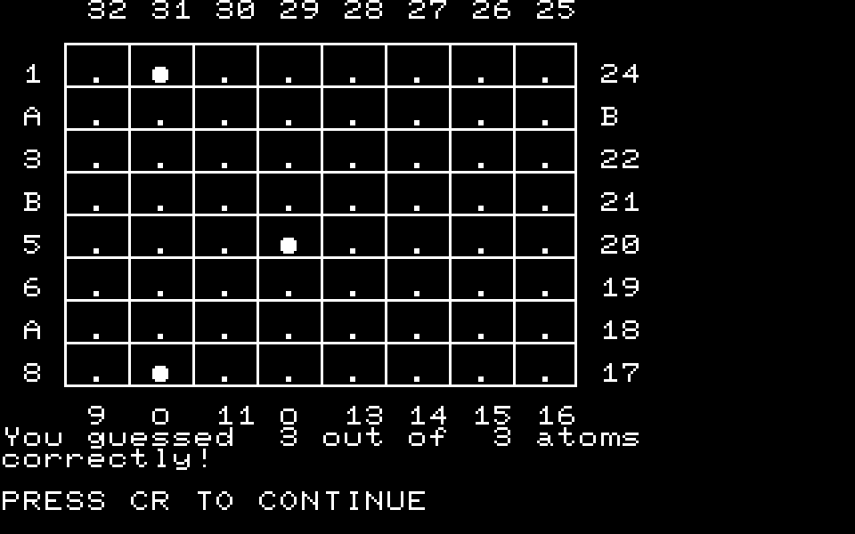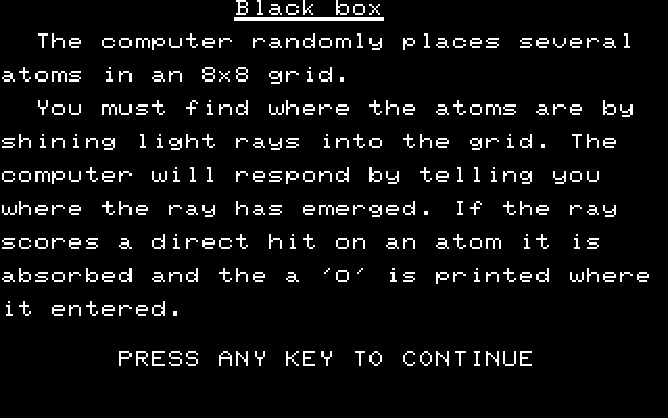 Du har en «sort boks» på 8*8 ruter. Inni denne befinner det seg en viss mengde atomer – du velger antallet selv, og jo flere du velger, jo vanskeligere blir oppgaven foran deg. Du skal nemlig identifisere hvilke ruter atomene befinner seg i, ved å skyte ut stråler og prøve å skjønne hvordan de reagerer.