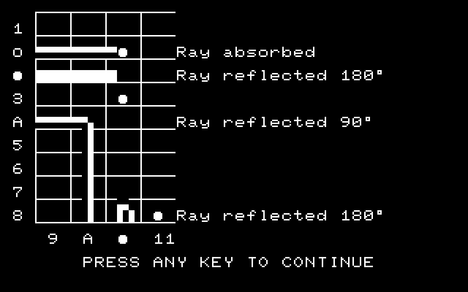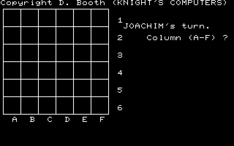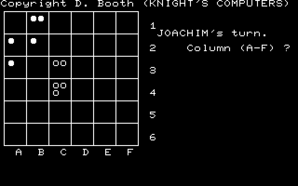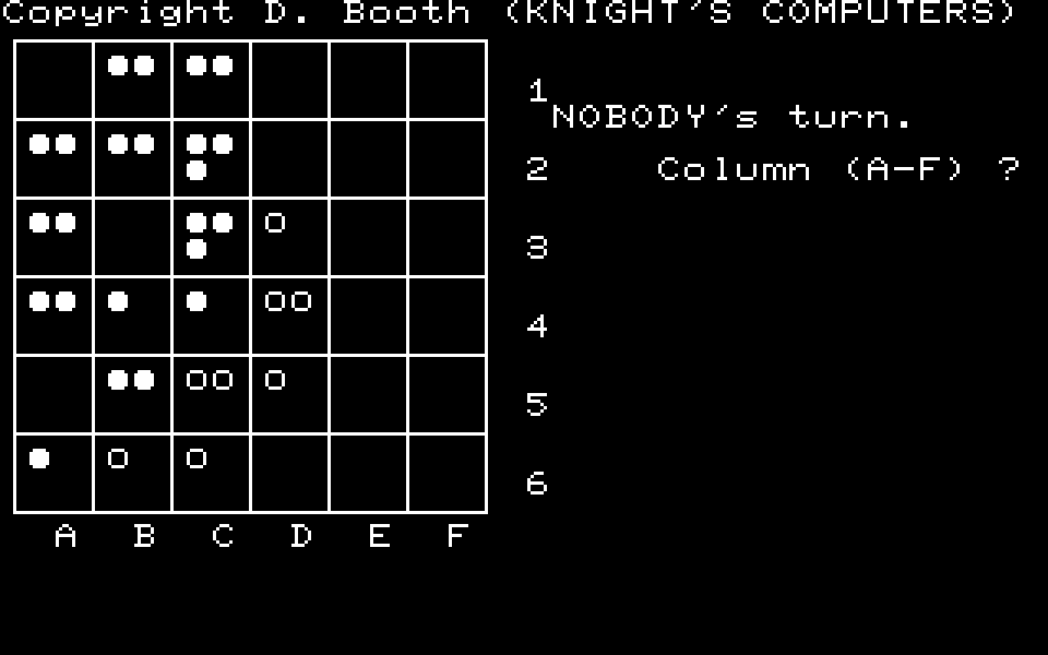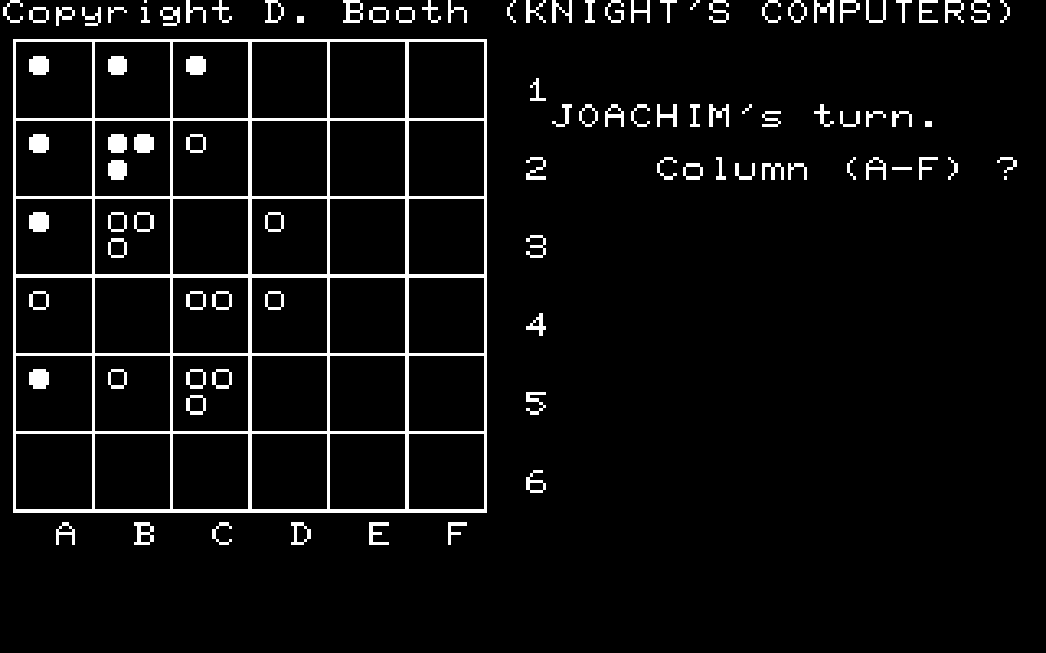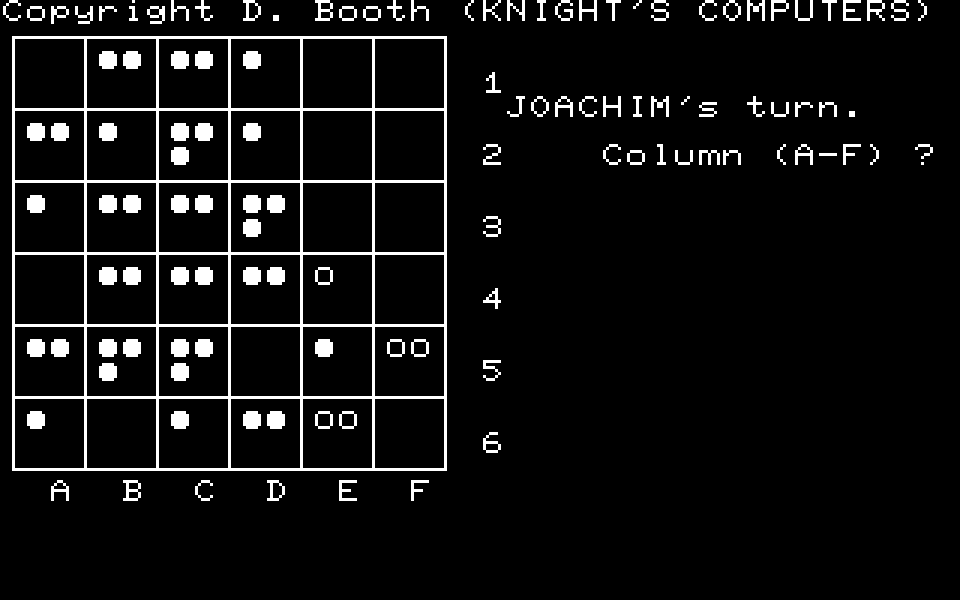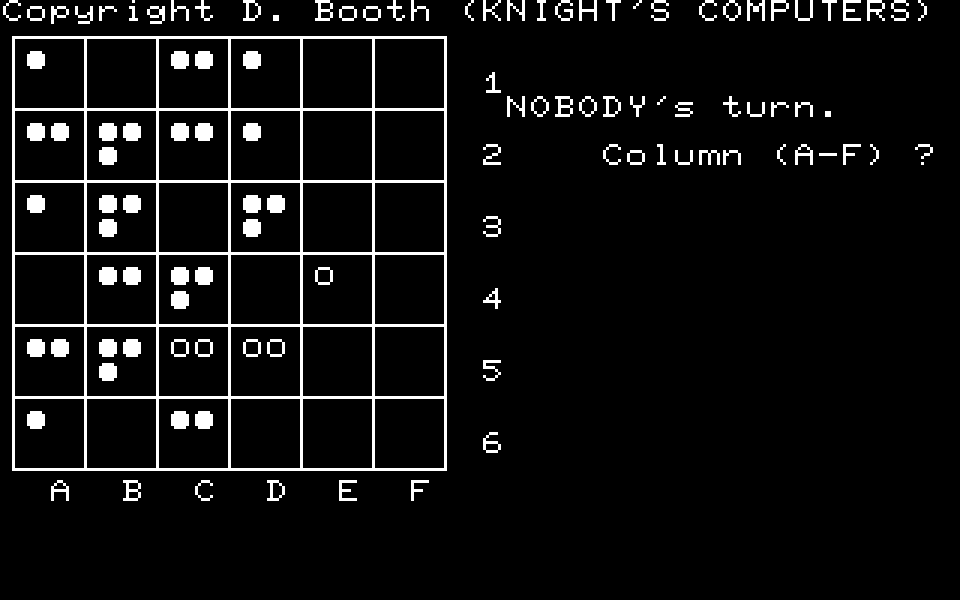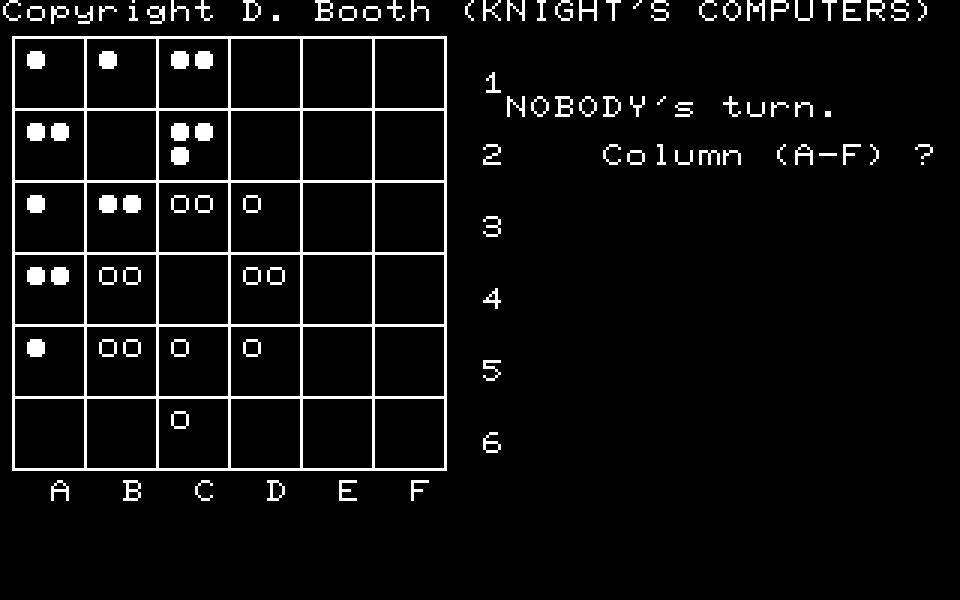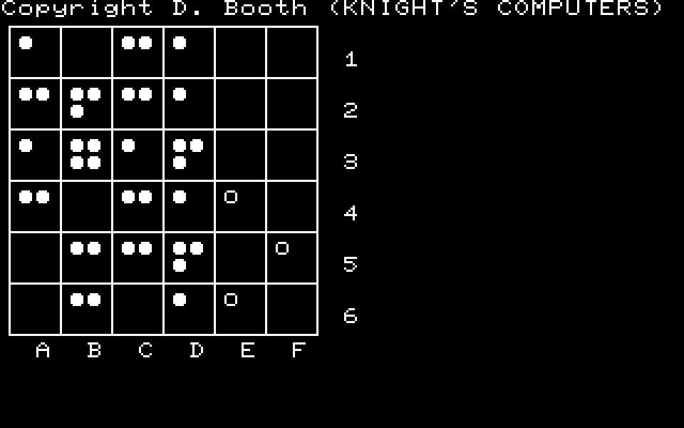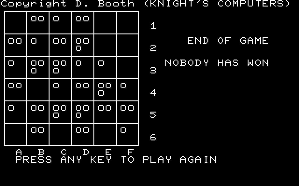 Det er faktisk ganske tilfredsstillende å gruble seg frem til løsningene her, så dette spillet likte jeg godt. Eller snarere, «spillkonseptet», for selve implementasjonen er ikke helt god. Tallene til kanonposisjonene overskrives av informasjonen spillet prøver å gi deg, og det blir vanskelig å holde oversikt etter hvert. I tillegg mistenker jeg at farger kunne gjort skjermbildet lettere å tolke. Det er ikke spillets skyld at det ikke kan ha farger, men jeg kan jo heller ikke late som jeg ikke sitter i 2024 [jeg skrev dette i januar i fjor, hvis du lurer på hvor raskt Spillhistorie ruller] og kan velge mellom en rekke bedre versjoner av dette konseptet.