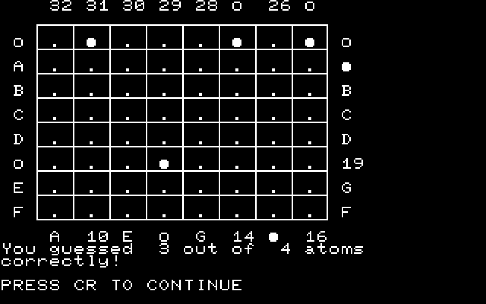 Så hvis du har ett atom i boksen, skyter ut en stråle fra posisjon 3 (venstre side, rad 3) og den ender på posisjon 10 (nederst, andre kolonne), så kan du fastslå at dette atomet ligger i ruten på rad 2, kolonne 3. Men hvis det er fire atomer i boksen, må du ha mer informasjon før du konkluderer, for strålene kan ha blitt påvirket flere gangere på sin vei gjennom boksen.