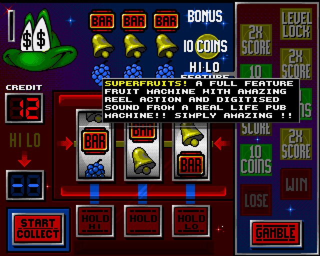 Før jeg avslutter: Demoen starter med noen reklamebilder fra resten av spillet, som minnet meg på at Superfrog faktisk hadde en ordentlig enarmet banditt-simulator innebygd som en bonusgreie du kunne låse opp mellom brettene for å vinne nye liv og slikt. I dag ville vel det vært «simulated gambling» og resultert i 18-årsmerkning.