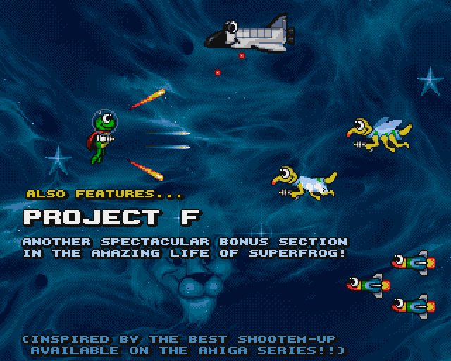 Her har vi en demo av en Amiga-kjendis, nemlig Superfrog fra Team 17. Samme gjengen som ga oss slåssespillet Body Blows på forrige måneds diskett, og som kanskje kommer til å servere Worms på en i fremtiden. Og mye annet også, tipper jeg.