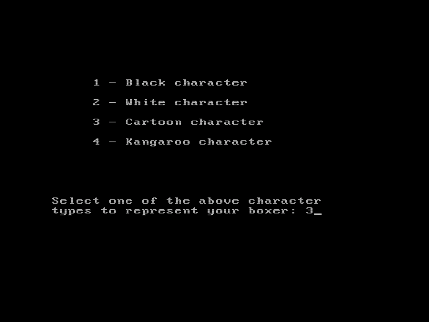 Vi må ikke glemme humoren. Midt i denne seriøse simuleringen kunne man velge karaktertype: «Black», «White», «Cartoon» eller… «Fighting Kangaroo». Det at jeg kunne sette opp en kamp mellom tungvektslegenden Jack Dempsey og en kenguru (og at CPU-en faktisk beregnet oddsen seriøst) er ren spillmagi.