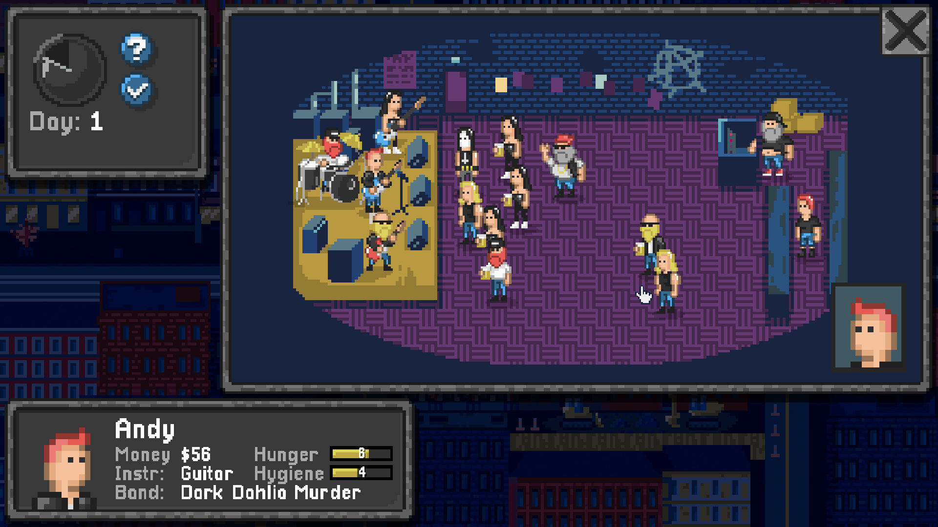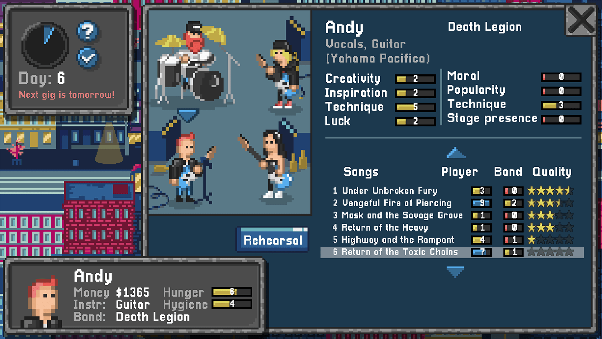 Nå jobber jeg med Legends of Rock, et rockeband-simulator inspirert av Jones in the Fast Lane (1991), der jeg gjør alt selv – bortsett fra musikken. Jeg har lært meg pixel art på et ganske enkelt nivå, og det er mye jeg fortsatt kan bli bedre på. Likevel er jeg fornøyd med hvordan det ser ut nå, med den begrensede fargepaletten.