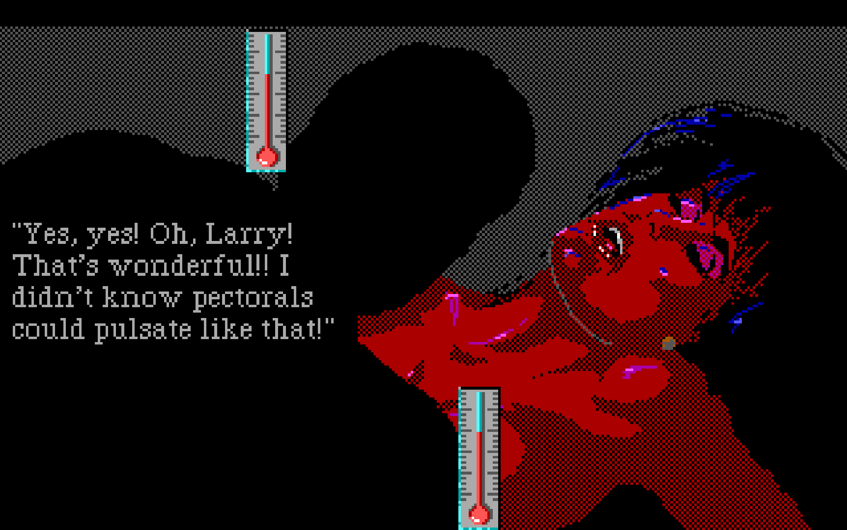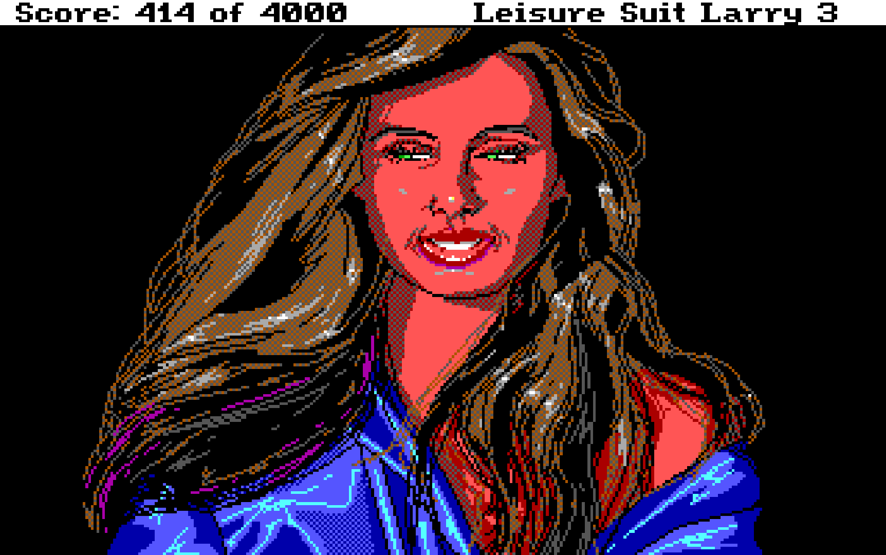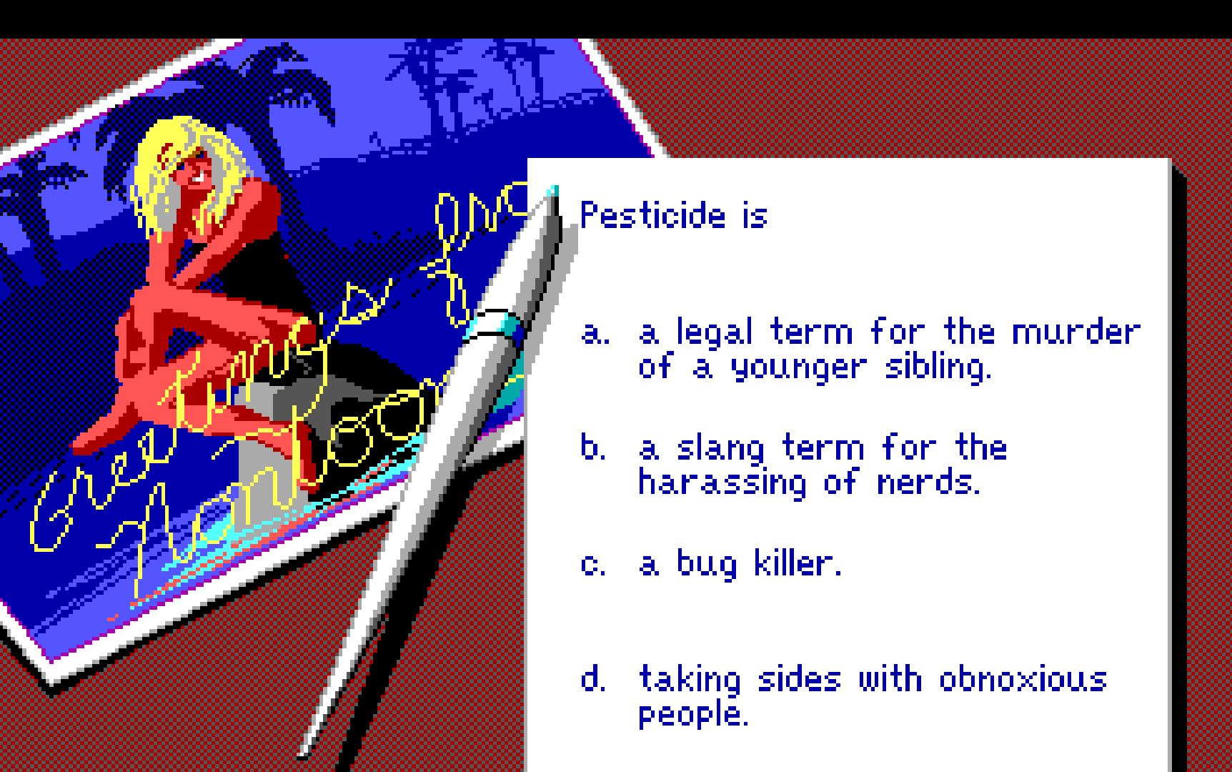 Det manualen ikke hjelper deg med er den aller første hindringen du møter i spillet, nemlig en quiz der svarene dine avgjør hvor sensurert spillet blir. Det gjelder å ha stålkontroll på utdatert amerikansk populærkunnskap om du skal få se nakne 16-fargers pupper. Skjønt det er egentlig ganske få slike i spillet, og det spørs om ikke sekvensen helt i starten – der Larry ser ei jente som kler av seg i leiligheten sin gjennom en turistkikkert (ikke creepy i det hele tatt!) – er den eneste der du faktisk får se noe. Hvis du hadde nok riktige svar på quizen, vel å merke.