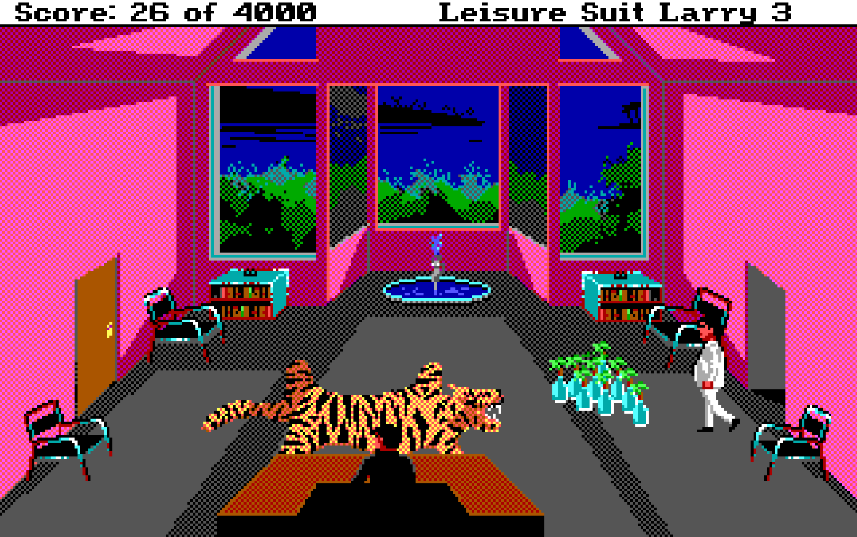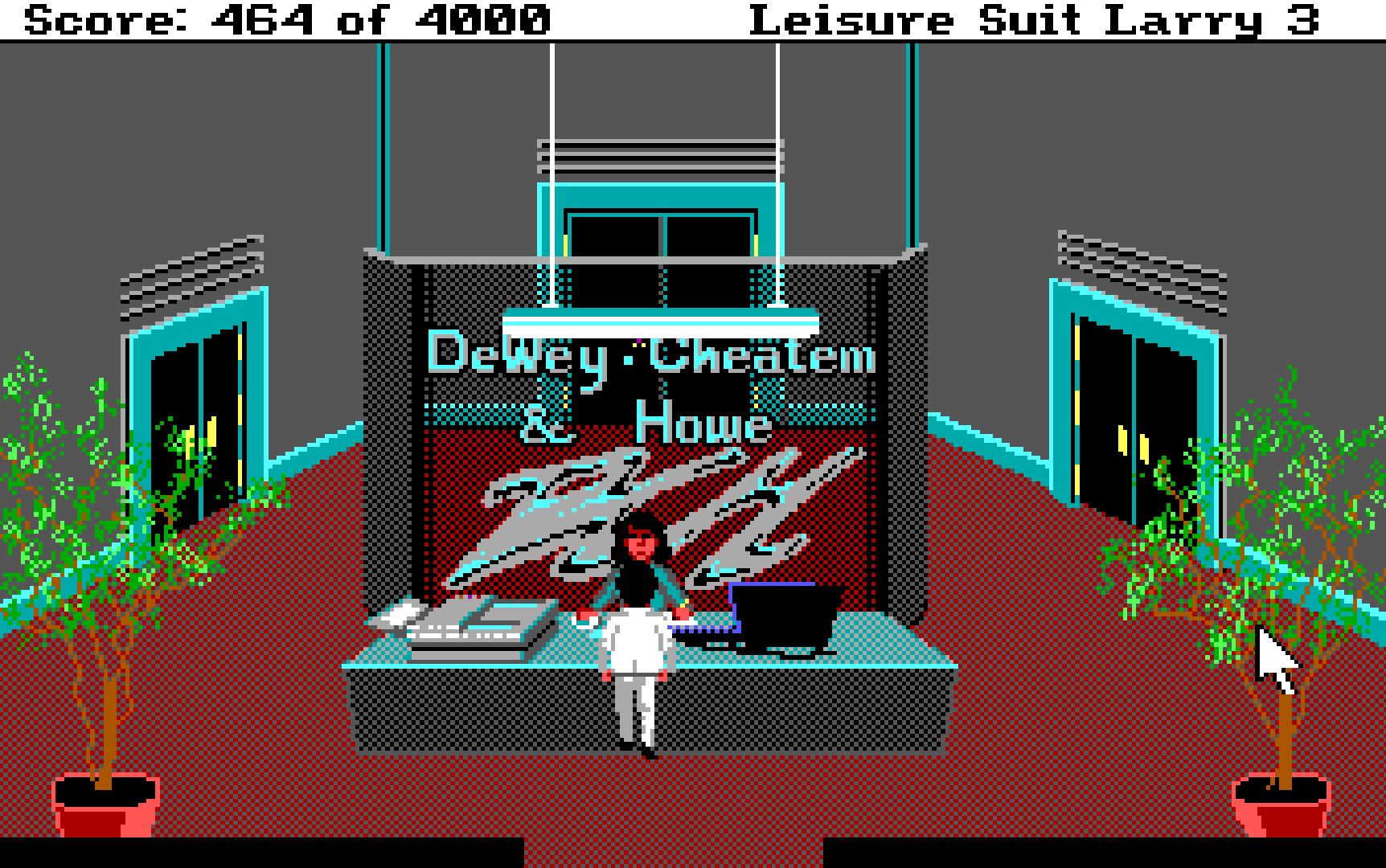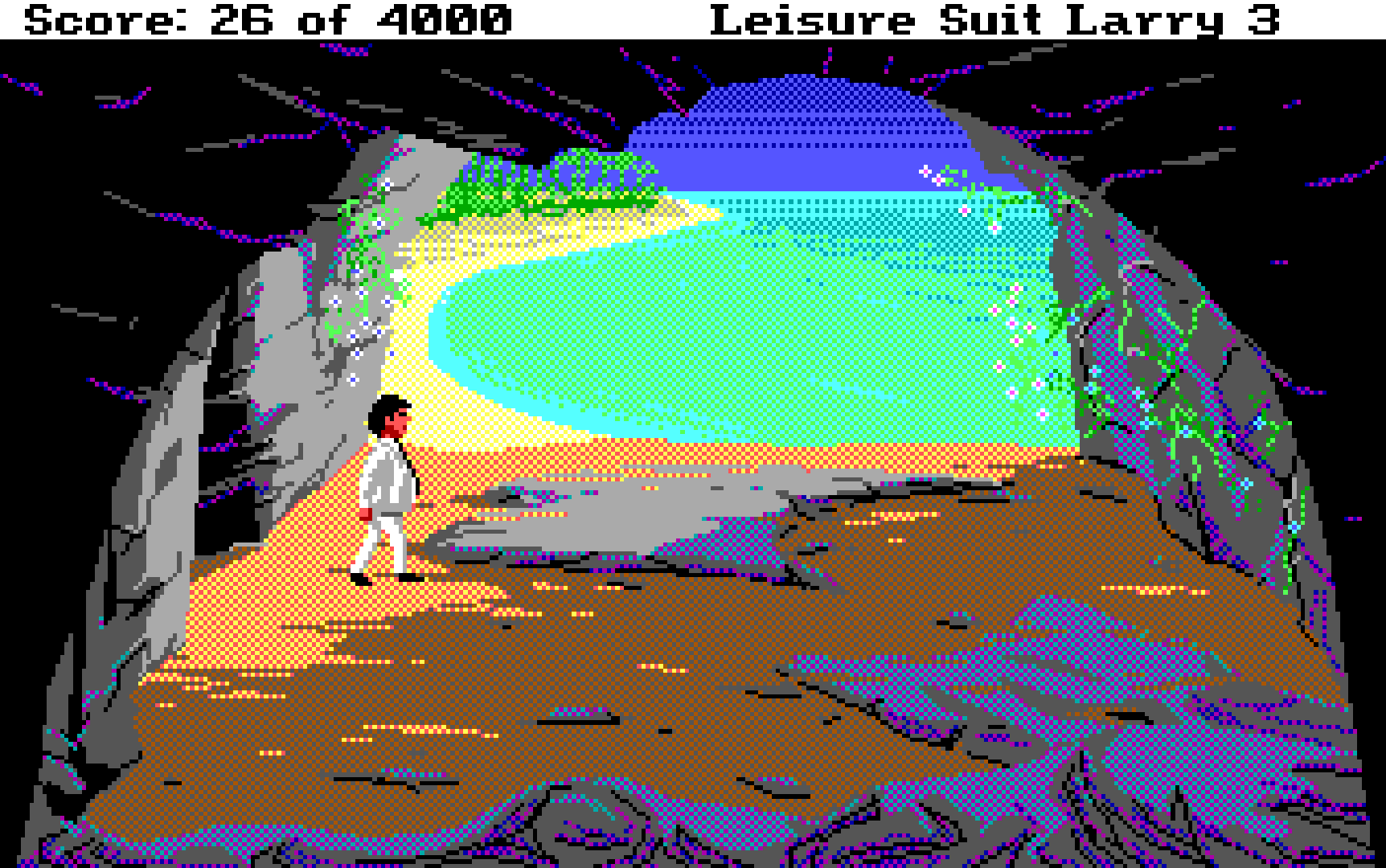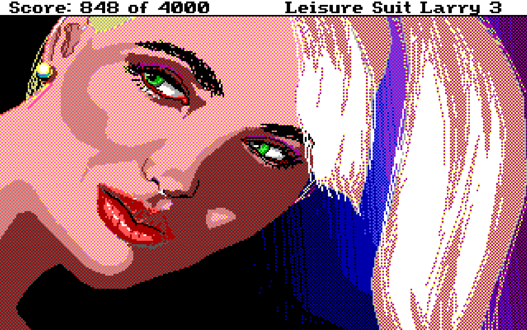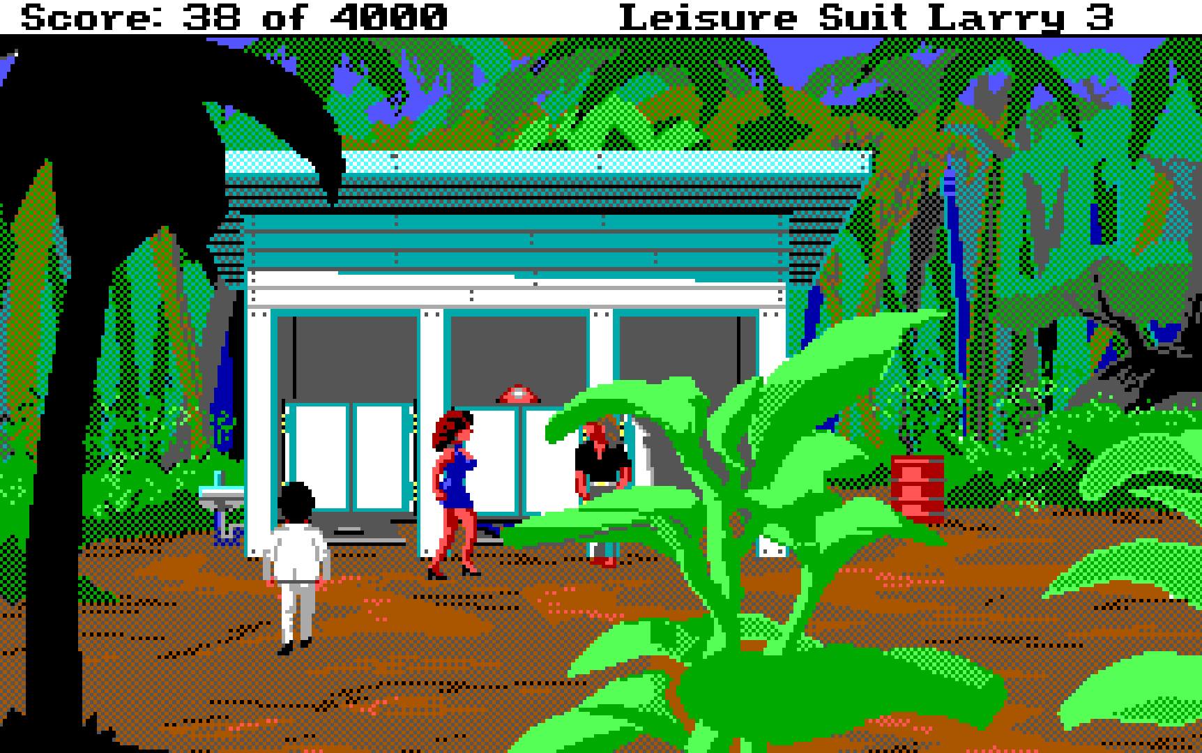 En av grunnene til at den gjennomsnittlige spilleren anno 2026 ikke kommer til å røre dette spillet er kontrollsystemet og presentasjonen. Larry III tilhører den generasjonen Sierra-spill som bruker 16-fargers EGA-grafikk og et grensesnitt der du styrer figuren din rundt med piltastene (musen er smått ubrukelig) og skriver inn kommandoer som «open door», «make lei» og «kiss woman» for å få ting til å skje. At ikke alle har sansen for dette, er forståelig – og slik var det forøvrig i 1989 også, og som vi vet var Lucasfilm Games allerede igang med å forvandle eventyrsjangeren for godt.